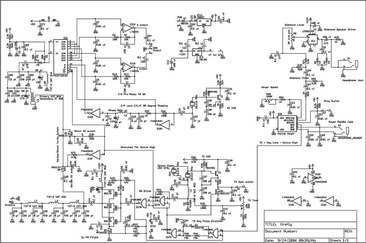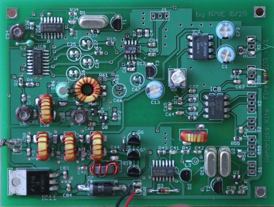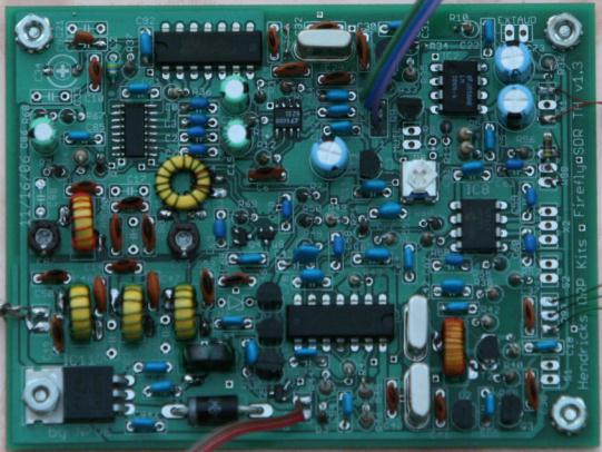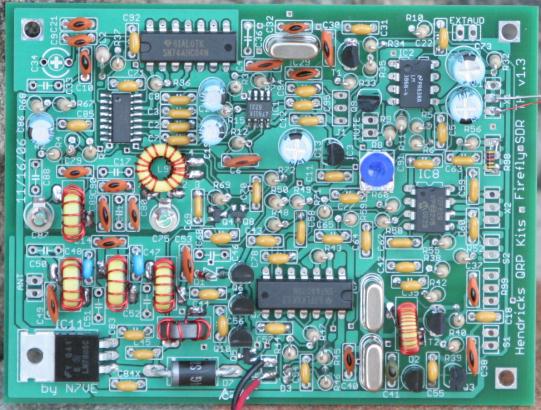 FireFly TransceiverBy Dan Tayloe, N7VE![]() Surface Mount Board ![]() Through Hole Board Hendricks QRP Kits is now offering the FireFly, which is a 30 Meter Transceiver Kit with an SDR Receiver and a conventional VXO Tuned Transmitter. The kit was designed by Dan Tayloe, N7VE, and here is his description of the transceiver. The cost of the through hole version is 75.00. Details are below. The Firefly SDR is a SDR receiver combined with a 2.5W VXO transmitter. This combination has been optimized for cw only operation. The FF SDR includes a built in keyer and includes a 1W audio output for driving a separate cw side tone monitor speaker and a high performance, solid state T/R switch for full break in QSK operation. The first version of the FF SDR is a 30m version. The final 30m FF SDR prototype has 2.6W output power and has a receiver sensitivity of -128 dbm as measured in a 500 Hz receiver bandwidth using a Presonus Firebox "sound card". The receiver is centered on 10.114 MHz and is capable of tuning +/- 24 KHz from that point. The VXO transmitter uses a two crystal "super VXO" configuration and nominally covers 10.102 to 10.113 MHz, although the actual tuning range will depend on the exact characteristics of the particular crystals you get. An SDR receiver has low level stereo audio outputs and is designed to feed into the audio sound card of a computer. Best receiver results will be obtain using a good sound card such as a Delta 44, which incorporates a high end 24 bit analog to digital (A/D) converter. However, even the 16 bit A/D converters of a typical PC sound card should provide usable received signals although at a reduced sensitivity. It is very amazing to be able to watch activity across a +/- 24 KHz segment of the band and know without tuning where the signals are and how strong they are. You can even watch DX pileups in progress. With the Firefly SDR, you can tune the transmitter exactly were you want it (visually!) using the spot function, then jump in and go for it. The FF SDR controls consist of a tuning knob for the VXO controlled TX, a TX spot switch, a cw speed control for the built in keyer, a programming push button for the keyer, a sidetone monitor speaker output, a keyer paddle input, a I/Q stereo output which is connected to the computer sound card, and an antenna jack. The basic kit does not include a case, nor external pots, switches, and jacks. Again, the FF SDR has been optimized for cw only operation. The use of a dedicated internal keyer chip with a 1w audio sidetone speaker output totally eliminates any lag associated with running cw on an SDR transceiver. This kit is sold out.